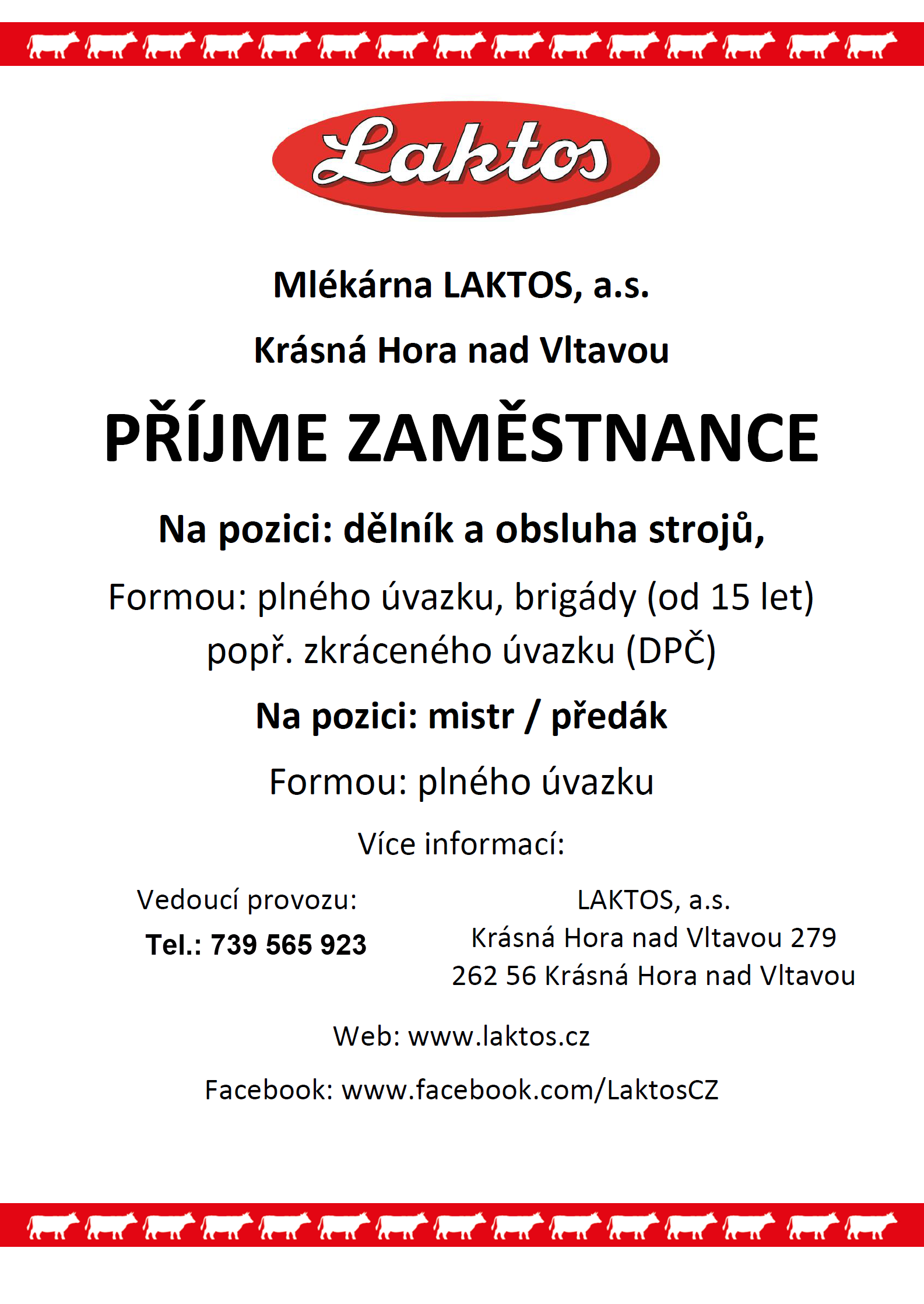 Přijmeme zaměstnance do mlékárny Laktos, a.s. – Krásná Hora nad Vltavou: